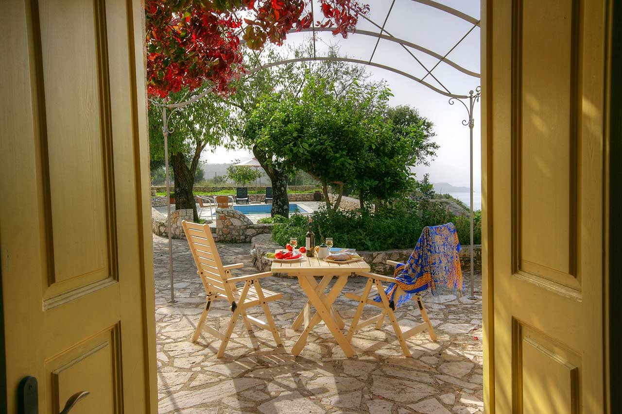 The accommodation is all on one level with high vaulted, colour washed pine ceilings which create a cool, spacious interior and by using natural materials such as wood and stone together with comfortable furnishings, a tranquil ambience has been created inside. The living area is open plan, comprising a bedroom area, which is separated by a low wall from the lounge, dining and kitchen areas. Doors not only allow the light to flood into the cottage but also lead out onto the large terrace where you can eat or just sit and enjoy the fantastic views across the sea to the Lixouri peninsular on the horizon. The terrace area also gives you easy access to the garden and swimming pool as well. The sunsets especially, where Lemoni is situated, are really stunning and not to be missed!