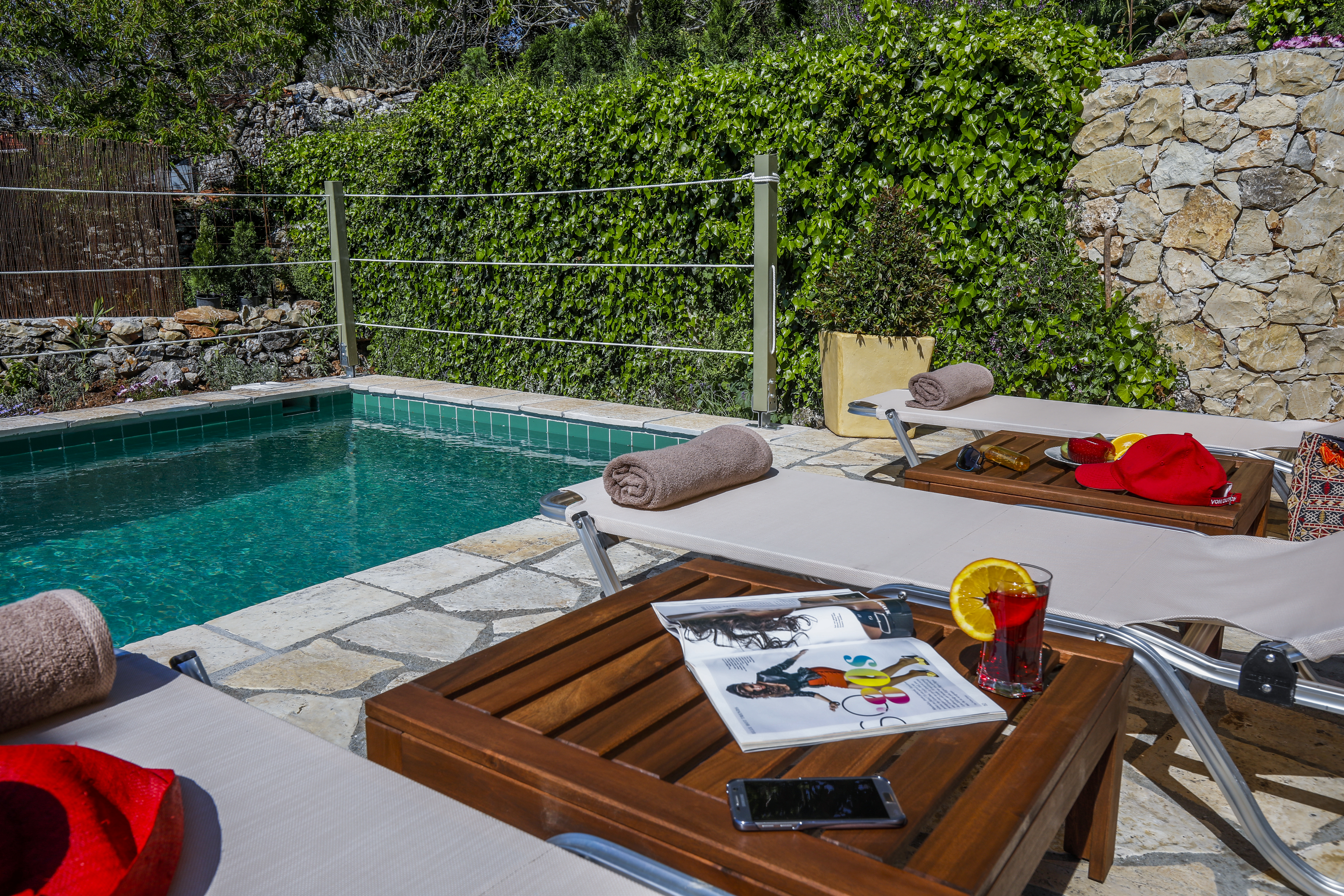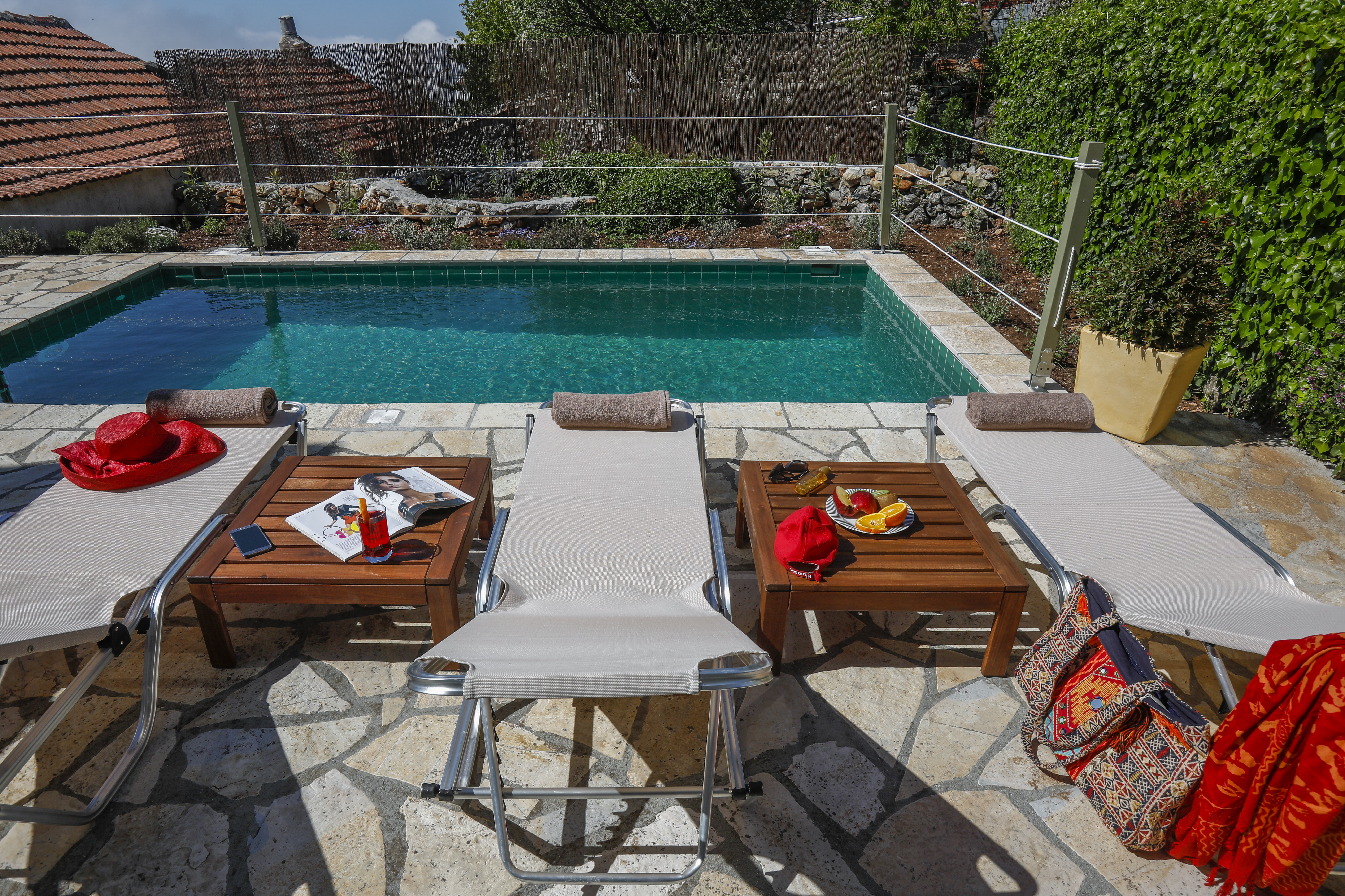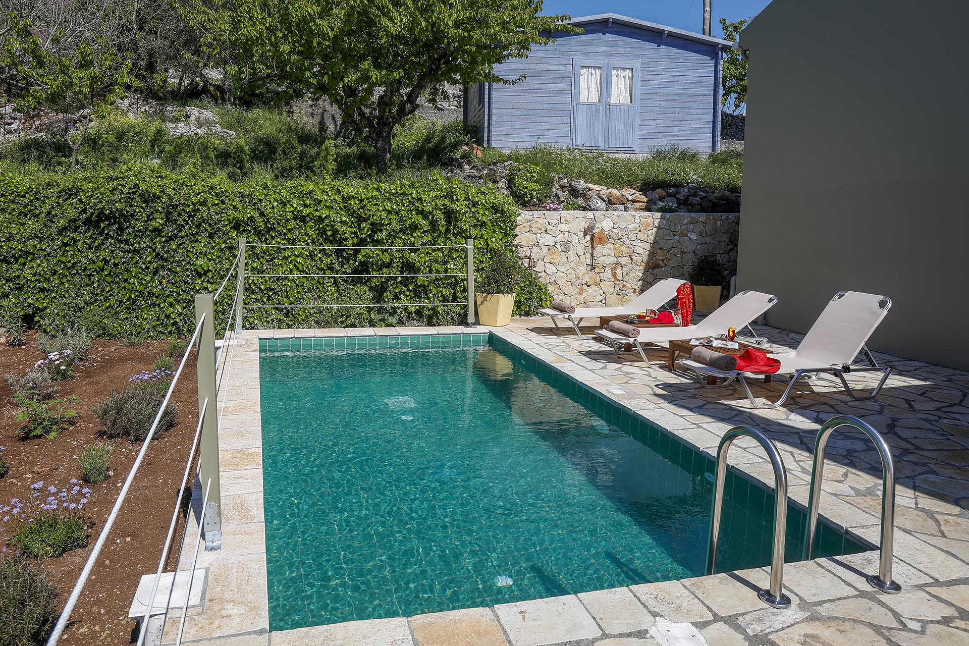 The property has a sunny pool deck with a 3 x 5 mtr plunge pool and plenty of loungers and shade.